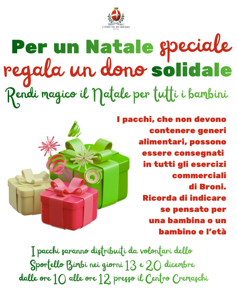 Il Natale Solidale di Broni: è iniziata la raccolta dei pacchi dono presso tutti gli esercizi commerciali di Broni ! Portagli il tuo pacco dono e ricorda di indicare se è destinato ad una bambino o ad una bambina e l'età....
