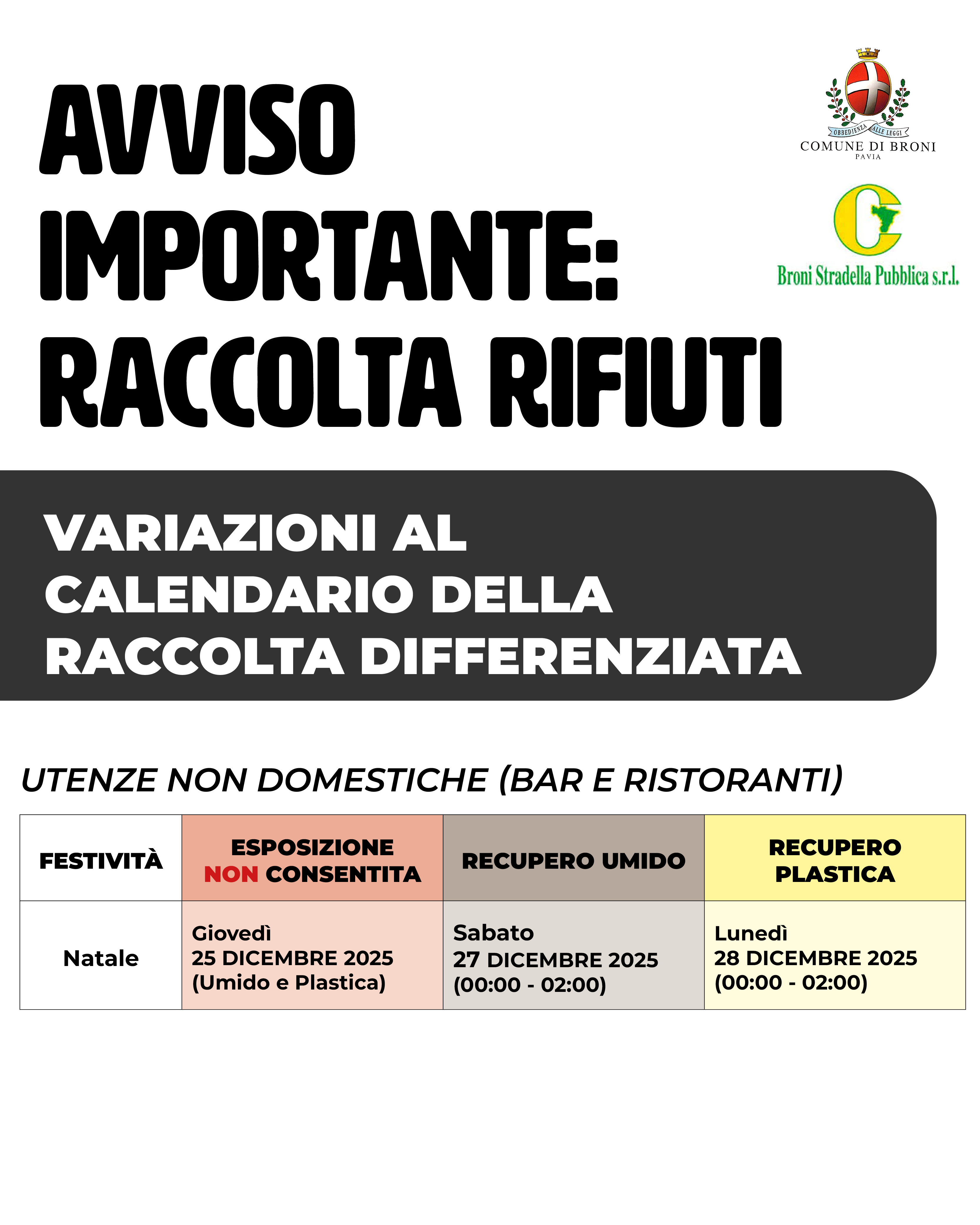 Pertanto, Broni Stradella Pubblica ha comunicato le opportune variazioni al calendario di raccolta per le utenze di bar e ristoranti.